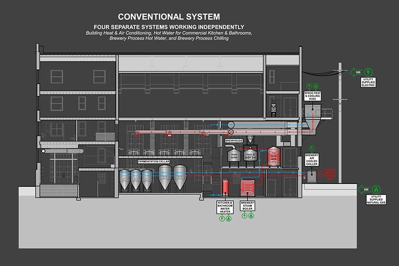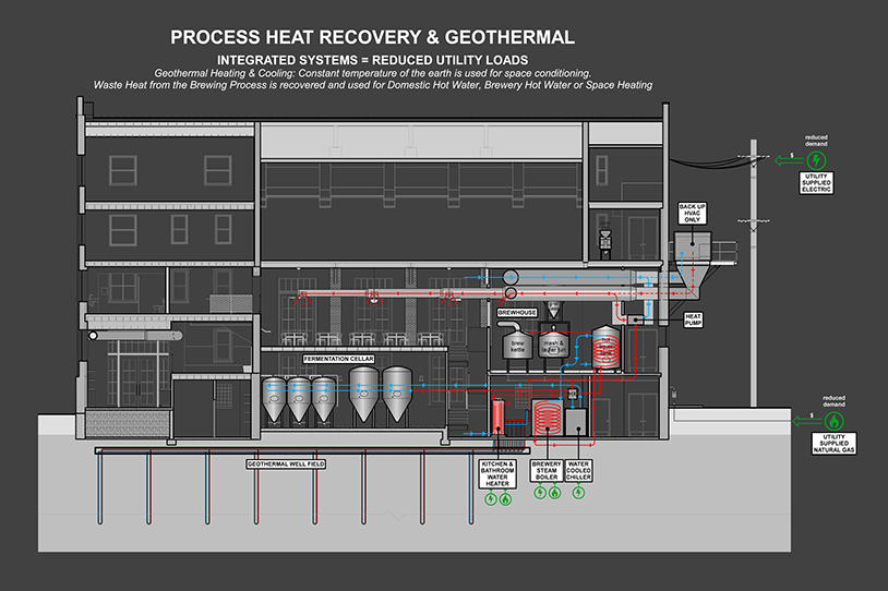 A unique geothermal heating and cooling system will integrate with the brewing process equipment to capture and reuse waste energy.