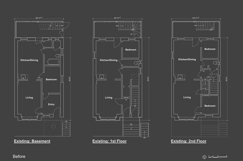 Located in the Pilsen Historic District of Chicago, a vacant and severely distressed three unit apartment building was restored and deconverted into a modern single family home. The small footprint – 729 sq ft per floor – provided an opportunity to create a unique vertical urban home.