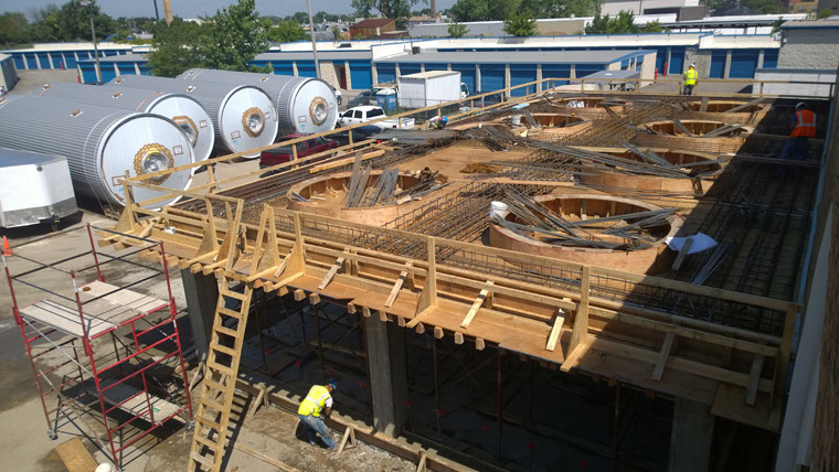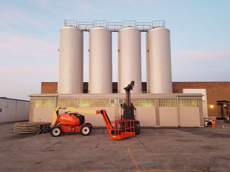 With continued success and increased demand for their beer, Revolution Brewing recently expanded their production facility. Having outgrown their existing space and the tanks required to increase capacity three-fold being too tall to fit inside the building, an addition was designed to suspend new 800 barrel fermentation vessels (weighing 320,000 pounds each) from a structural concrete roof with enclosed working cellar below. The 90,000 sq ft facility now accommodates a second 120 barrel brewhouse, a wet mill, an automated keg line, additional cold storage, a shipping office, and corporate offices.