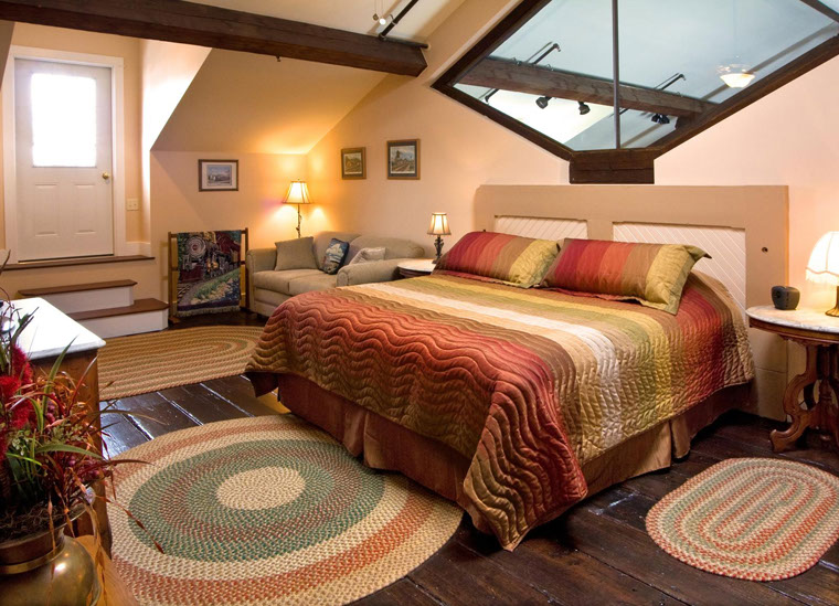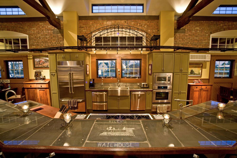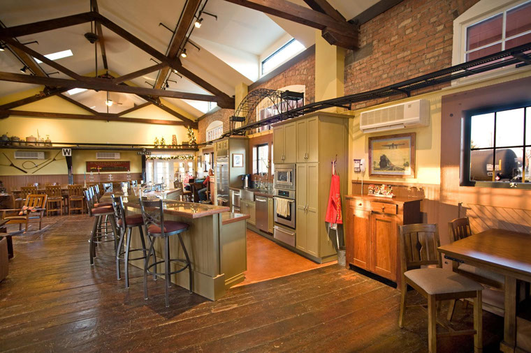 The original open lofts were converted into guest bedrooms with private lookouts over one of the nation’s major freight arteries. The large common area contains an oversized fireplace and an open kitchen for guest service, as well as for hosting private events. The large open space showcases the client’s extensive collection of railroad antiques and memorabilia, and a G-scale model railroad circulates throughout the main room.