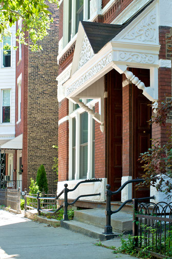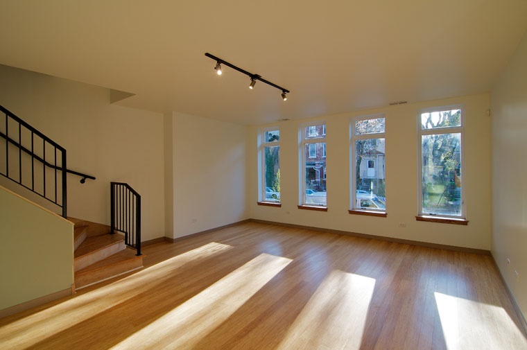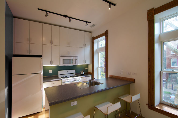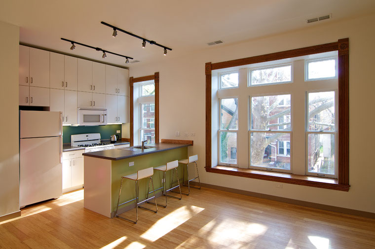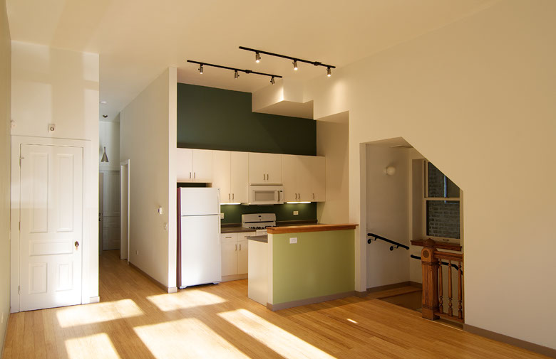 With Chicago East Village Landmark District approval, a neglected historic four unit apartment building on an oversized lot was gutted, the basement underpinned, and the interior completely renovated, deconverting it into three spacious units. An ICF addition housing three new units was constructed on adjacent land to create a total of six contemporary apartments. The addition’s front façade utilizes common brick reclaimed from a garage demolished at the rear yard. The façade sets back from the historic context to preserve a long standing garden.